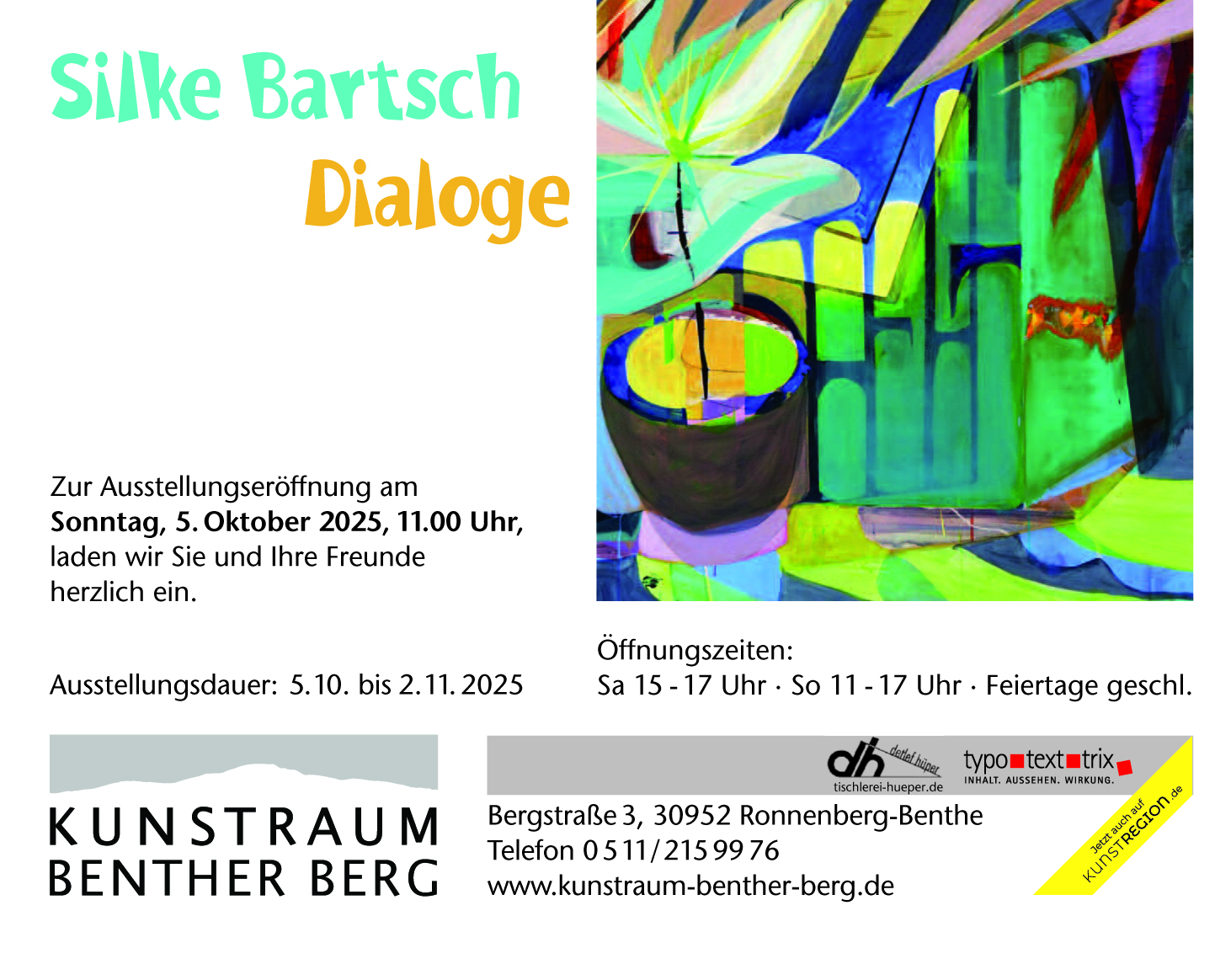 am kommenden Sonntag, den 05. Oktober um 11.00 Uhr laden wir Sie zu unserer neuen Ausstellung im Kunstraum Benther Berg ein.